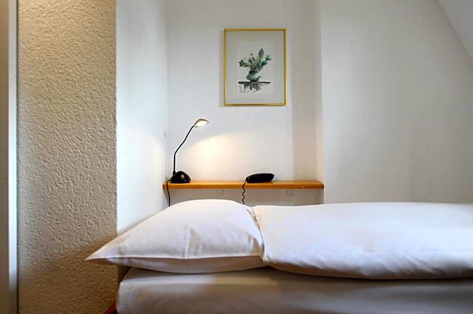Simply furnished, small room with a window to the courtyard and a private external bathroom (consisting of a shower and toilet) in the hall, right in front of the room.